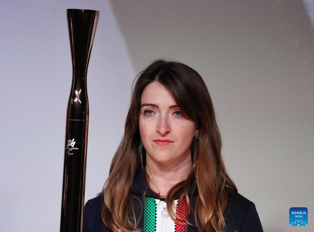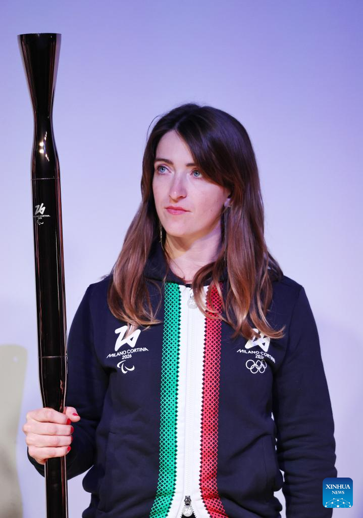 Former Italian cross-country skier Stefania Belmondo holds the Olympic torch during the unveiling ceremony of the torches for Milano Cortina 2026 Olympic and Paralympic Winter Games in Milan, Italy, April 14, 2025. (Xinhua/Li Jing)