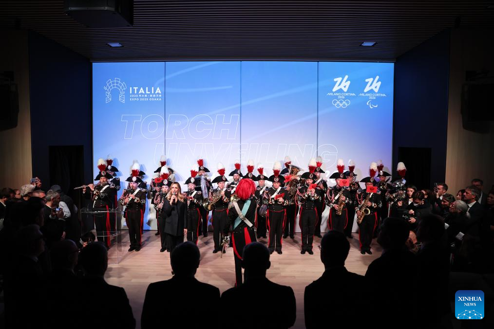 This photo taken on April 14, 2025 shows the unveiling ceremony of the torches for Milano Cortina 2026 Olympic and Paralympic Winter Games at the Italy Pavilion in Osaka, Japan. (Xinhua/Jia Haocheng)