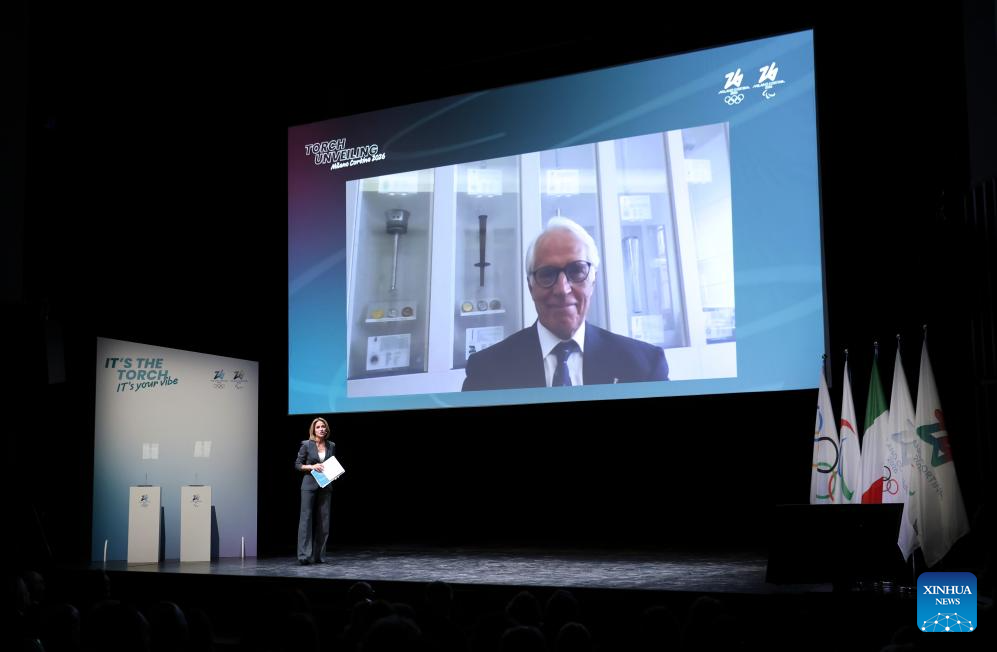 Giovanni Malago, president of Milano Cortina 2026, speaks via video link during the unveiling ceremony of the torches for Milano Cortina 2026 Olympic and Paralympic Winter Games in Milan, Italy, April 14, 2025. (Xinhua/Li Jing)