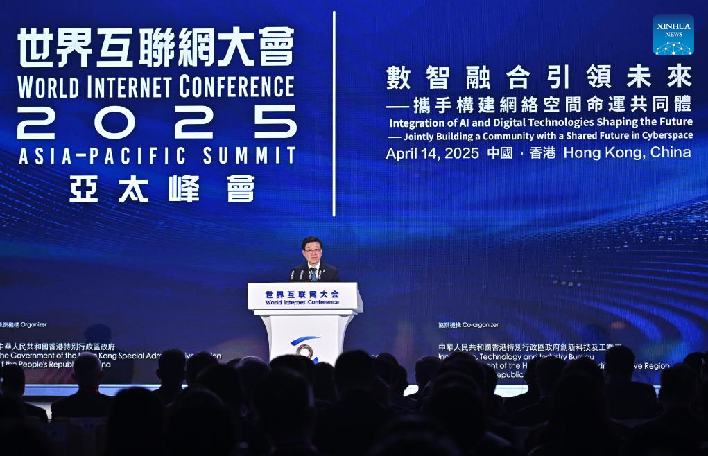 John Lee, chief executive of China's Hong Kong Special Administrative Region (HKSAR), delivers a speech at the opening ceremony of the 2025 World Internet Conference Asia-Pacific Summit in Hong Kong, south China, April 14, 2025. The 2025 World Internet Conference Asia-Pacific Summit kicked off here Monday, attracting nearly 1,000 participants from around the globe to explore future development and potentials across various domains in digital technology. (Xinhua/Lui Siu Wai)