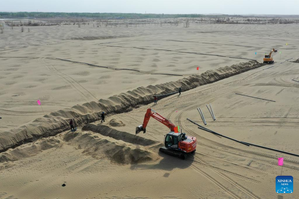 People arrange drip irrigation pipes at a sand-control experimental base in Yutian County of Hotan Prefecture, northwest China's Xinjiang Uygur Autonomous Region, April 8, 2025.