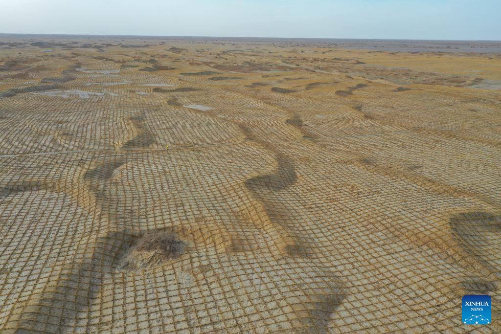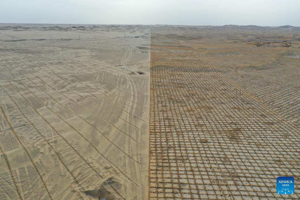 An aerial drone photo taken on April 8, 2025 shows checkerboard sand barriers at a sand-control zone in Minfeng County of Hotan Prefecture, northwest China's Xinjiang Uygur Autonomous Region.
