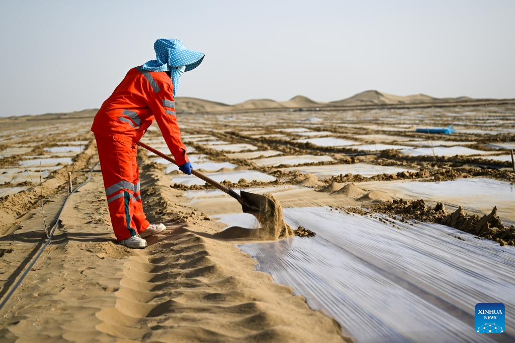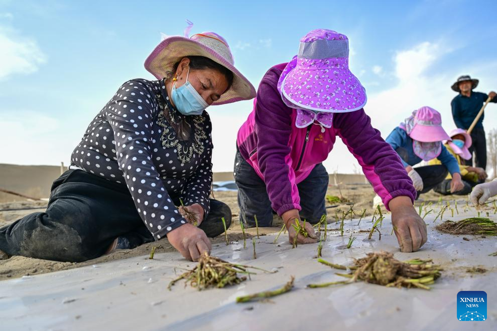 Staff members plant onions in sandy land at a sand-control experimental station in Minfeng County of Hotan Prefecture, northwest China's Xinjiang Uygur Autonomous Region on April 8, 2025.