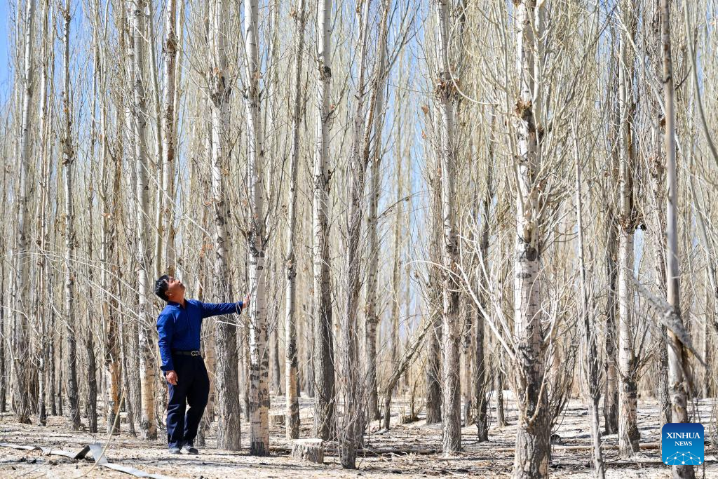 Fu Guoxi checks the trees at a green belt built by his father Fu Zhizhou in Hejing County, the Mongolian Autonomous Prefecture of Bayingolin, northwest China's Xinjiang Uygur Autonomous Region, April 11, 2025. Over the past four decades, Fu Zhizhou had planted more than 800,000 trees and his son Fu Guoxi took over the cause after his father passed away in 2024.