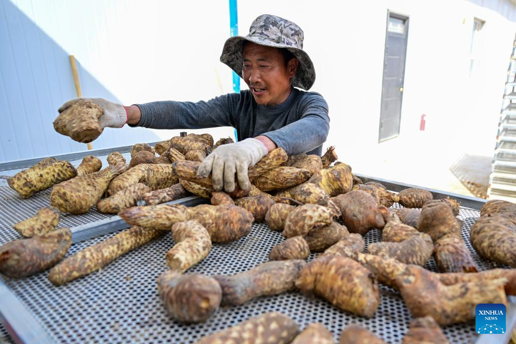 A staff member dries cistanche at a cistanche planting base in Qiemo County, the Mongolian Autonomous Prefecture of Bayingolin, northwest China's Xinjiang Uygur Autonomous Region on April 9, 2025.