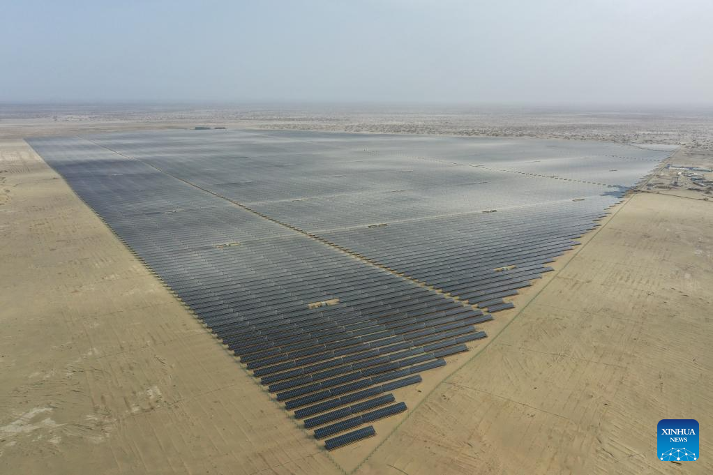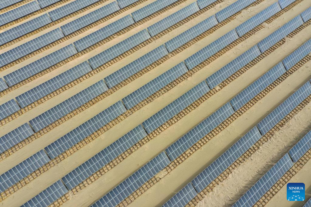 An aerial drone photo taken on April 13, 2025 shows a photovoltaic power project in Xayar County, Aksu Prefecture, northwest China's Xinjiang Uygur Autonomous Region.