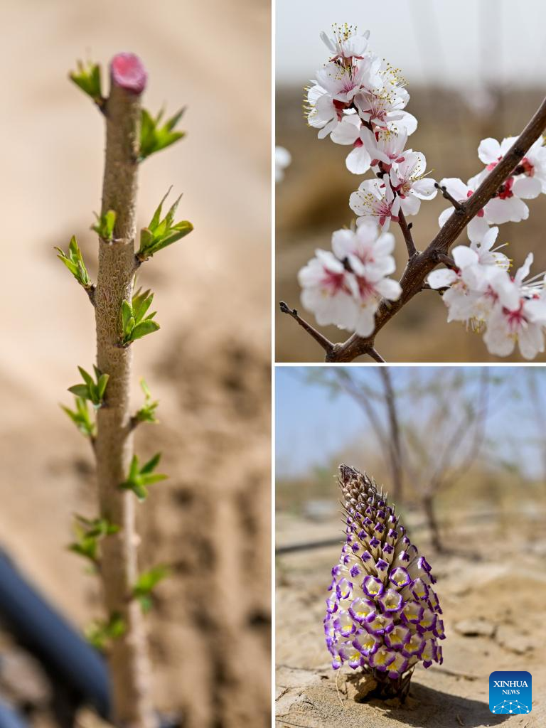 This combo photo shows a rose seedling (L) and cistanche (lower R) at sand-control model zones of Yutian County, Hotan Prefecture on April 8, 2025, and apricot blossoms in Baicheng County, Aksu Prefecture on April 12, 2025 (upper R) in northwest China's Xinjiang Uygur Autonomous Region.