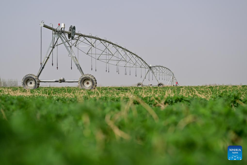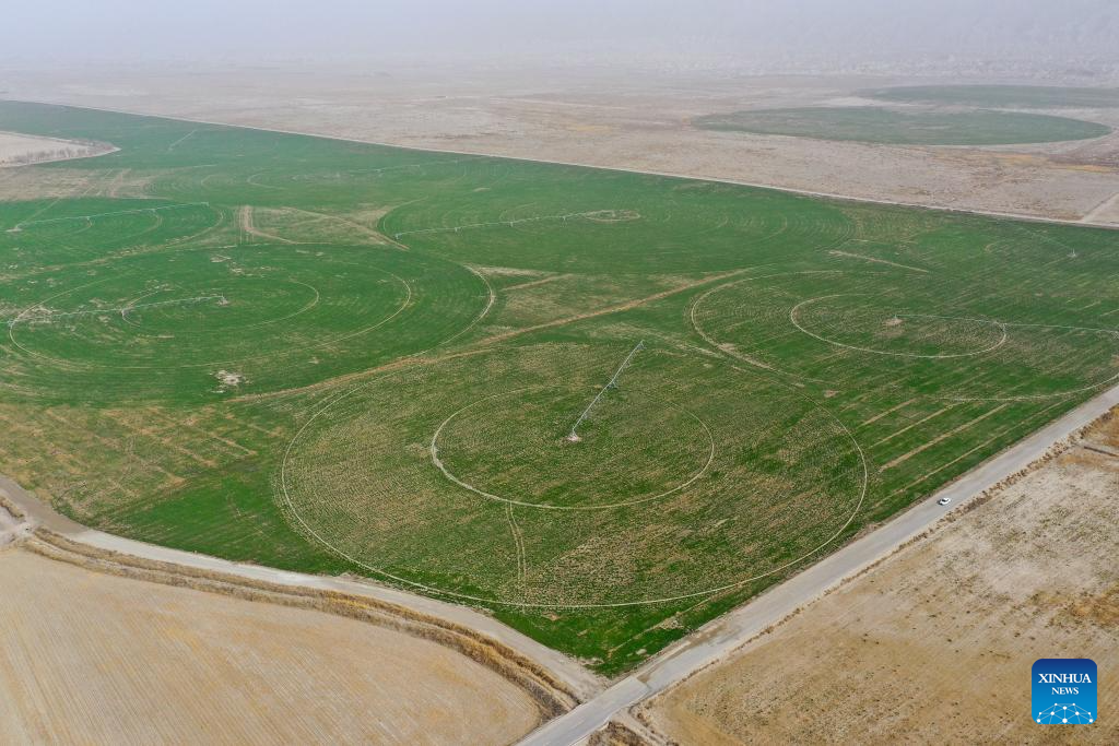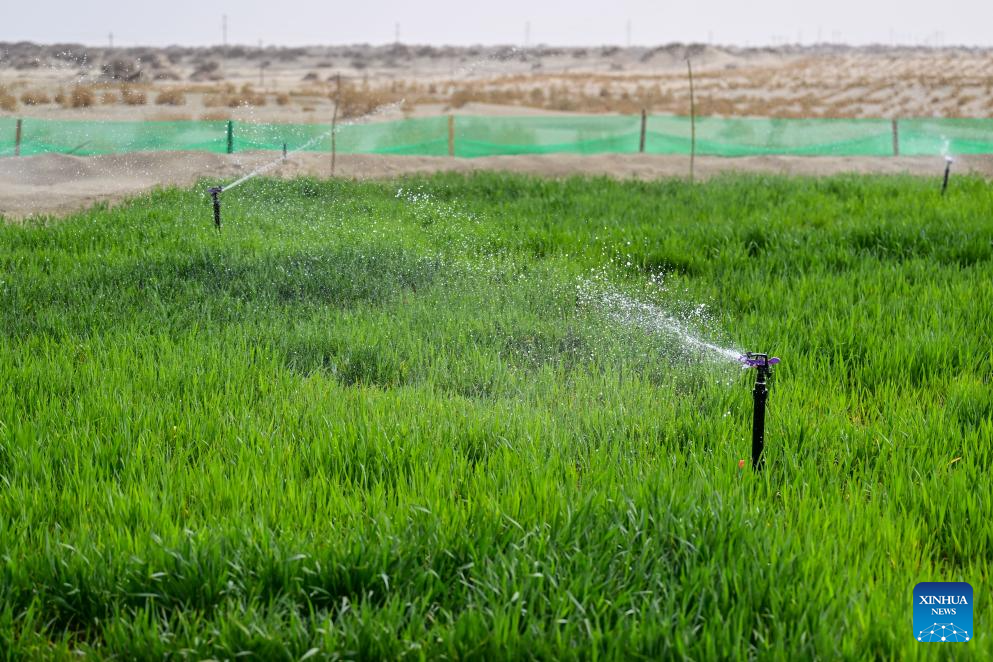 This photo taken on April 13, 2025 shows a wheat field irrigated by desalinated water in Xayar County, Aksu Prefecture, northwest China's Xinjiang Uygur Autonomous Region.