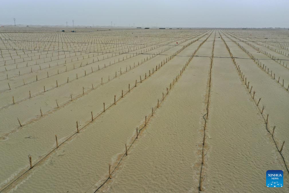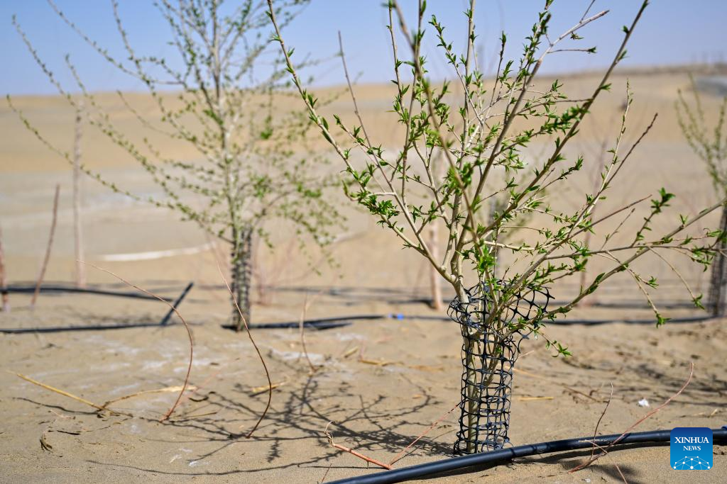 Protective nets are attached to seedlings to prevent animals from eating them at a sand-control base in Qiemo County, the Mongolian Autonomous Prefecture of Bayingolin, northwest China's Xinjiang Uygur Autonomous Region, April 9, 2025.