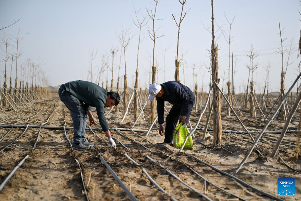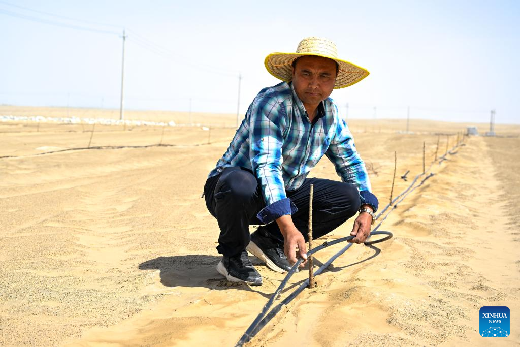 A villager arranges a drip irrigation pipe at a desert-control model zone in Yutian County of Hotan Prefecture, northwest China's Xinjiang Uygur Autonomous Region, April 8, 2025.