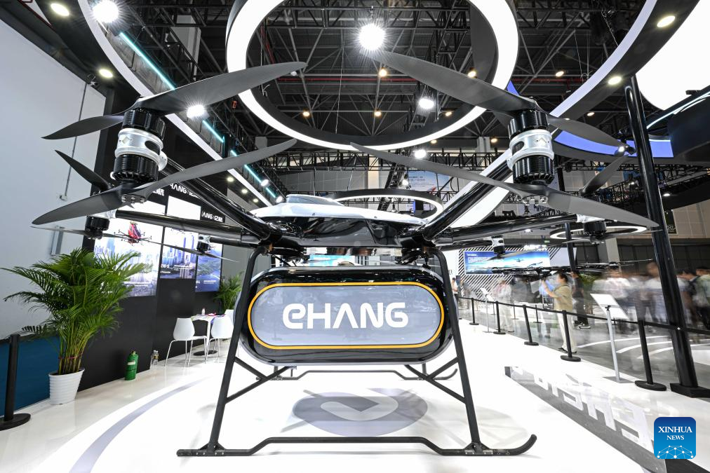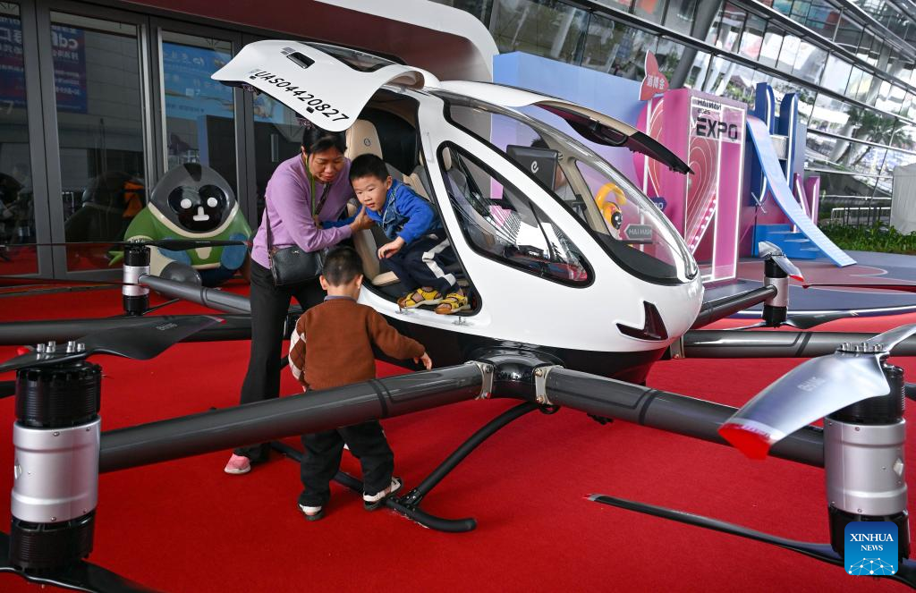 Slated from April 13 to 18, this year's expo features dedicated exhibition zones for groundbreaking innovations in artificial intelligence (AI) and low-altitude economy for the first time. Making its debut this year, the low-altitude economy zone showcases eVTOL aircraft, flying cars, and drones. (Xinhua/Guo Cheng)