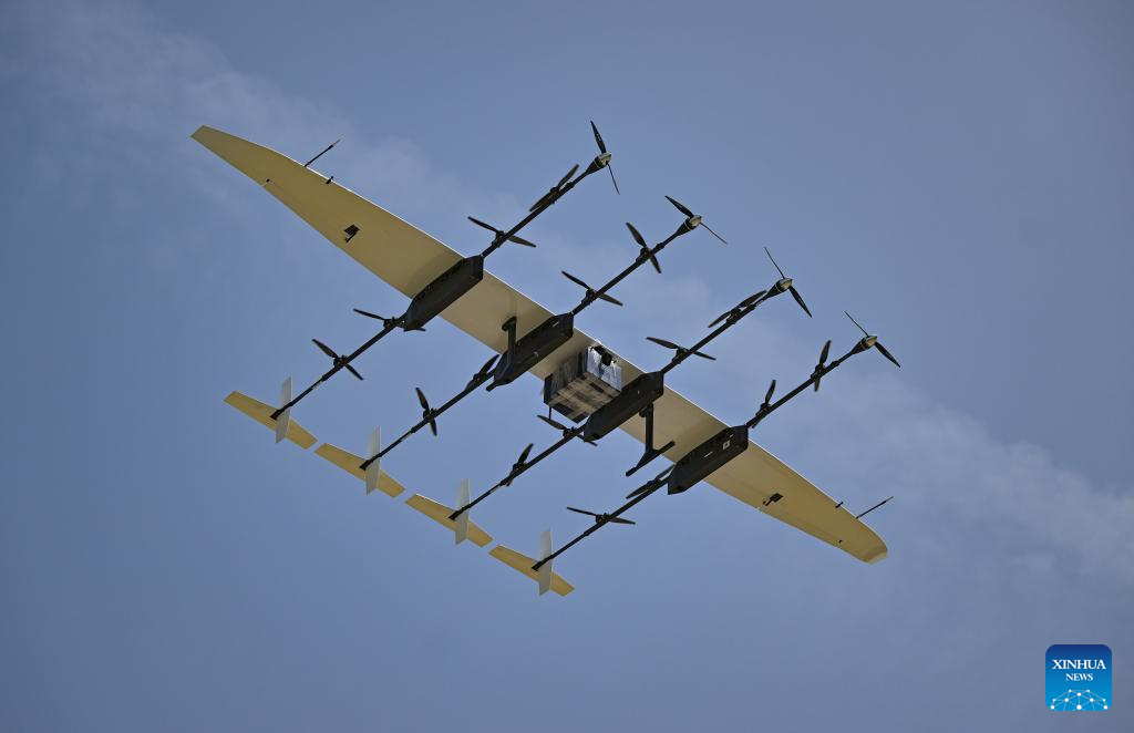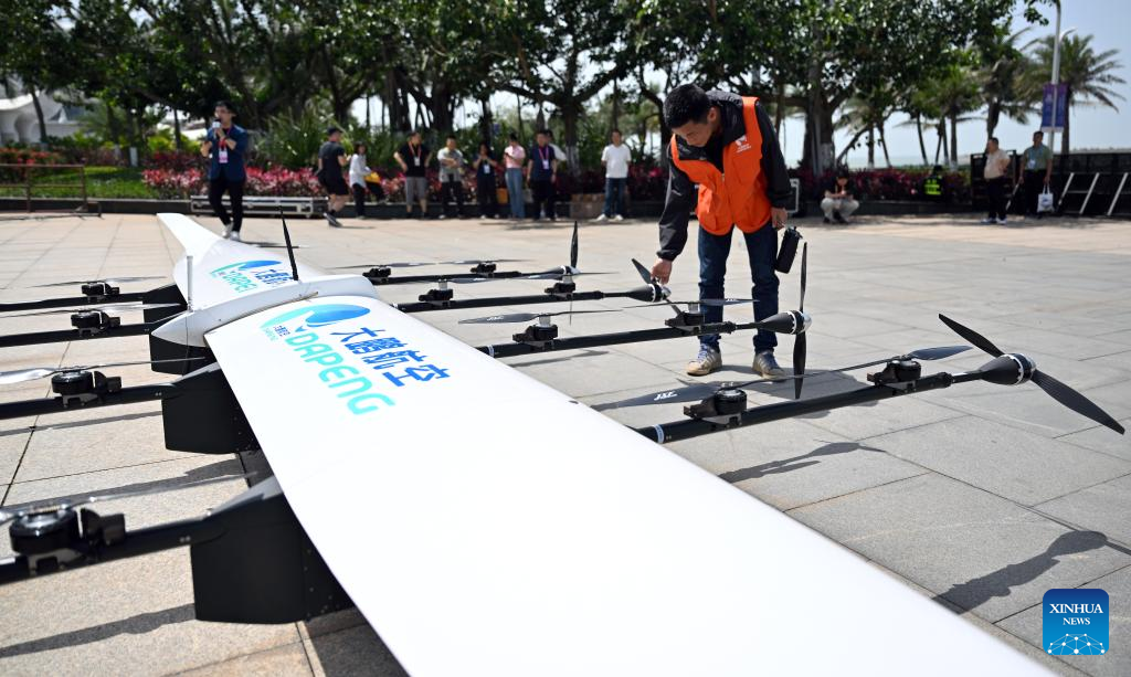 A logistics drone loaded with goods and heading for Xuwen Port in Guangdong Province takes off outside the exhibition hall of the 5th China International Consumer Products Expo (CICPE) in Haikou, south China's Hainan Province, April 14, 2025.