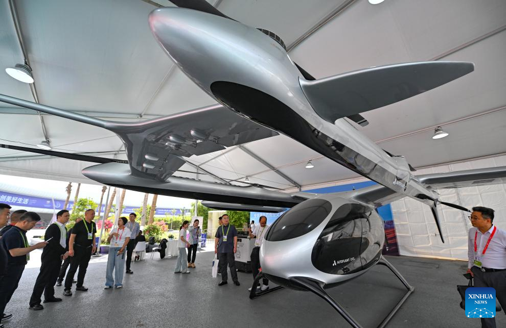 An eVTOL (electric vertical takeoff and landing) aircraft is displayed at the 5th China International Consumer Products Expo (CICPE) in Haikou, south China's Hainan Province, April 14, 2025.