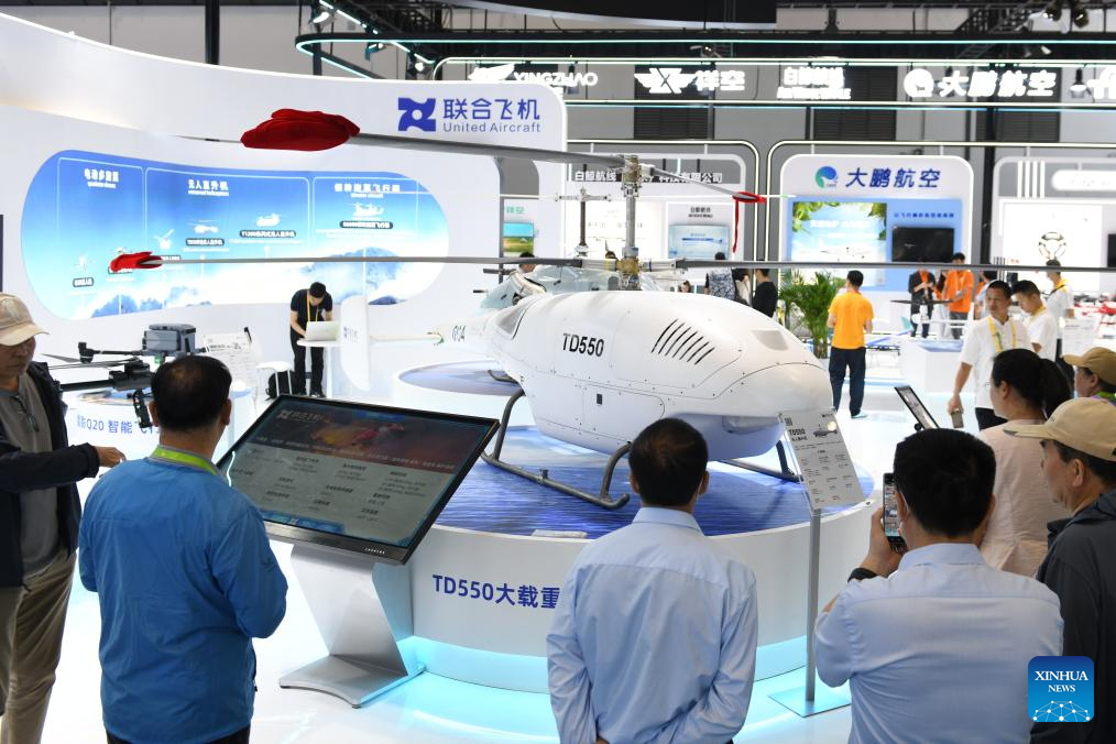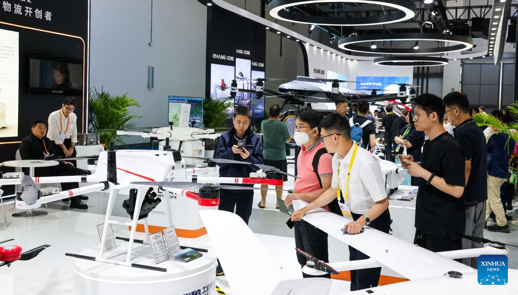 Slated from April 13 to 18, this year's expo features dedicated exhibition zones for groundbreaking innovations in artificial intelligence (AI) and low-altitude economy for the first time. Making its debut this year, the low-altitude economy zone showcases electric vertical takeoff and landing (eVTOL) aircraft, flying cars, and drones. (Xinhua/Sun Xiaotian)