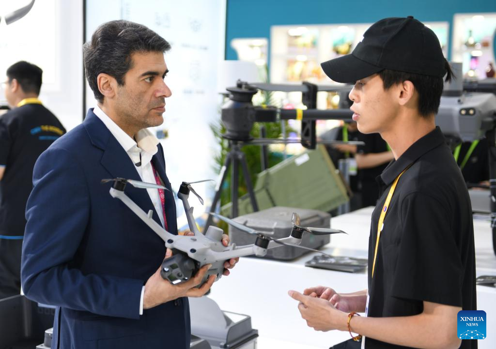 A staff member introduces a product to a visitor at the booth of DJI at the 5th China International Consumer Products Expo (CICPE) in Haikou, south China's Hainan Province, April 15, 2025.