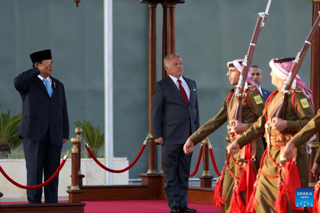 King Abdullah II (2nd L) of Jordan and Indonesian President Prabowo Subianto (1st L) review a guard of honor at Marka Military Airport in Amman, Jordan, on April 13, 2025. King Abdullah II of Jordan and Indonesian President Prabowo Subianto on Monday condemned Israeli violations against the Al-Aqsa Mosque and attempts to divide it both "temporally and spatially," according to a statement by Jordan's Royal Court. (Photo by Mohammad Abu Ghosh/Xinhua)