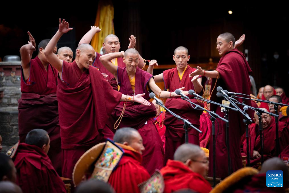 Monks attend a debate and award ceremony conferring the title of Geshe Lharampa at the Jokhang Temple in Lhasa, capital of southwest China's Xizang Autonomous Region, April 15, 2025. Thirteen monks obtained the degree of Geshe Lharampa, the highest academic degree in the exoteric teachings of the Gelug school of Tibetan Buddhism, here on Tuesday. Geshe Lharampa, which means "intellectual" in the Tibetan language, is the equivalent of a doctoral degree in modern education. (Xinhua/Tenzing Nima Qadhup)