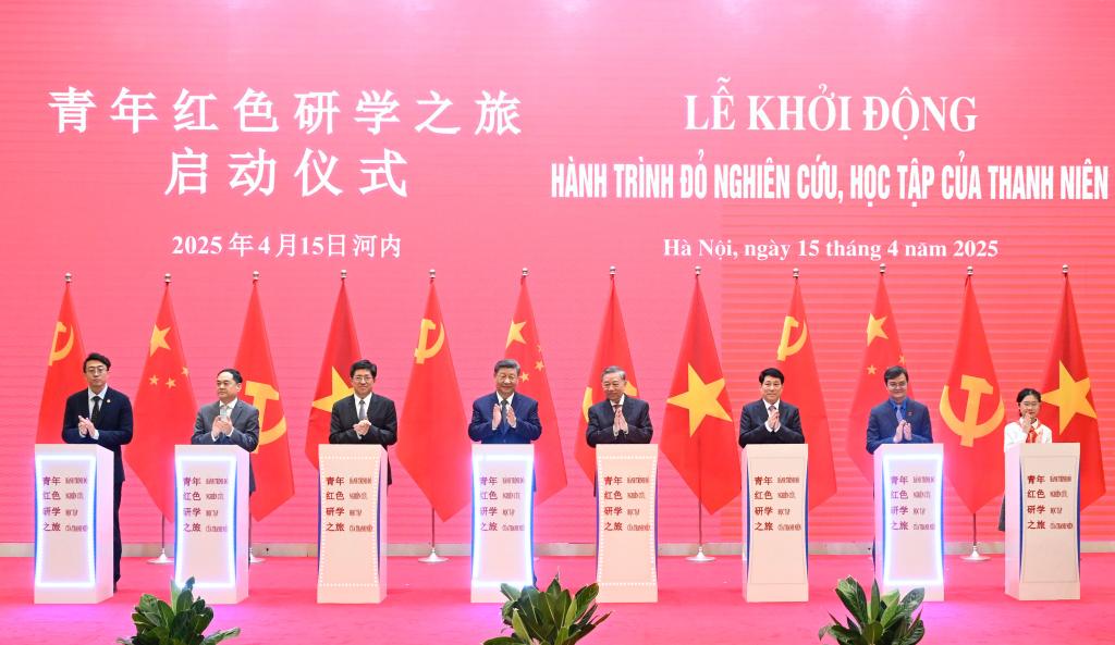 Chinese President Xi Jinping, also general secretary of the Communist Party of China (CPC) Central Committee, General Secretary of the Communist Party of Vietnam Central Committee To Lam and Vietnamese President Luong Cuong jointly launch the "Red Study Tours" project at the International Convention Center in Hanoi, capital of Vietnam, April 15, 2025. The three leaders jointly launched the project after they met with representatives of the Chinese and Vietnamese People's Friendship Meeting here. (Xinhua/Shen Hong)