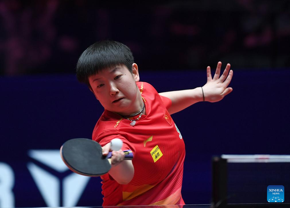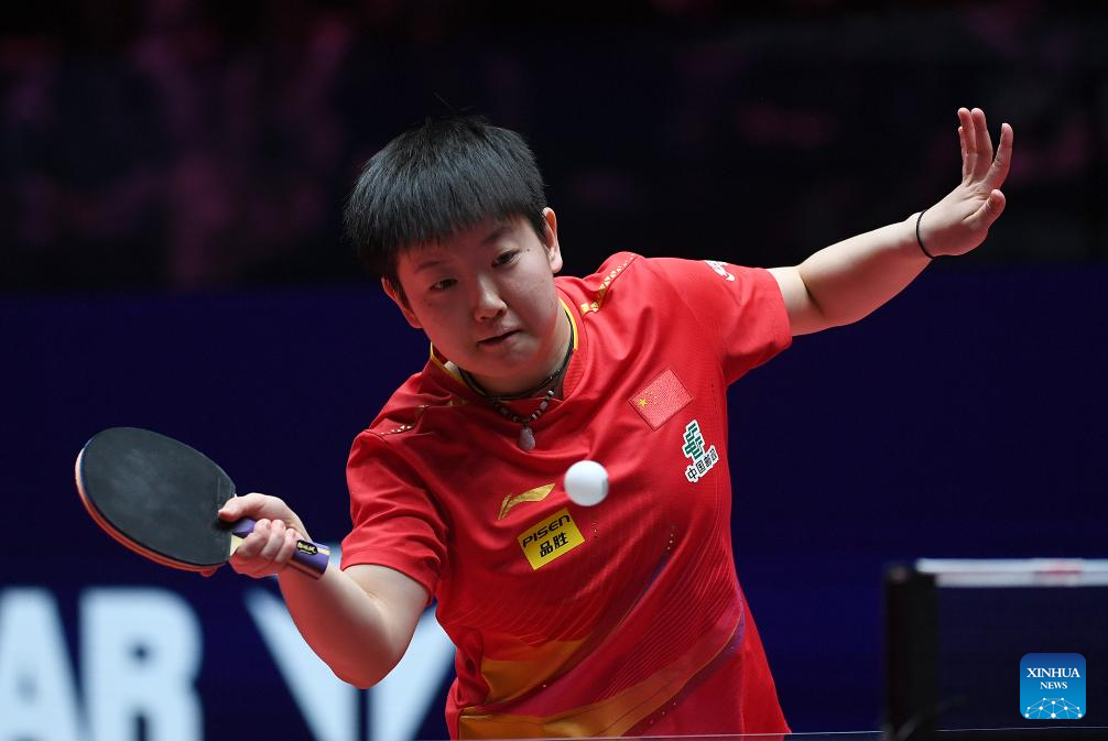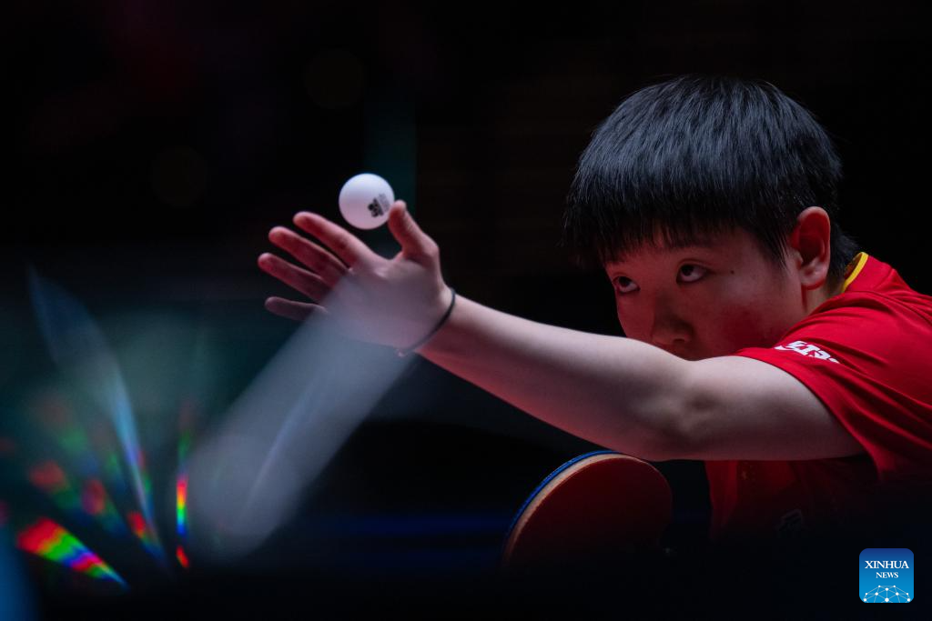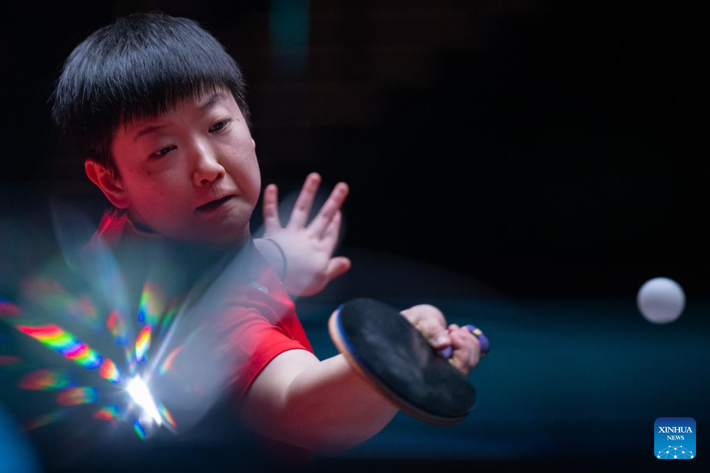 Sun Yingsha hits a return during the women's singles group match between Sun Yingsha of China and Zhang Mo of Canada at the ITTF Men's and Women's World Cup 2025 in Macao, China, April 15, 2025. (Xinhua/Chen Duo)