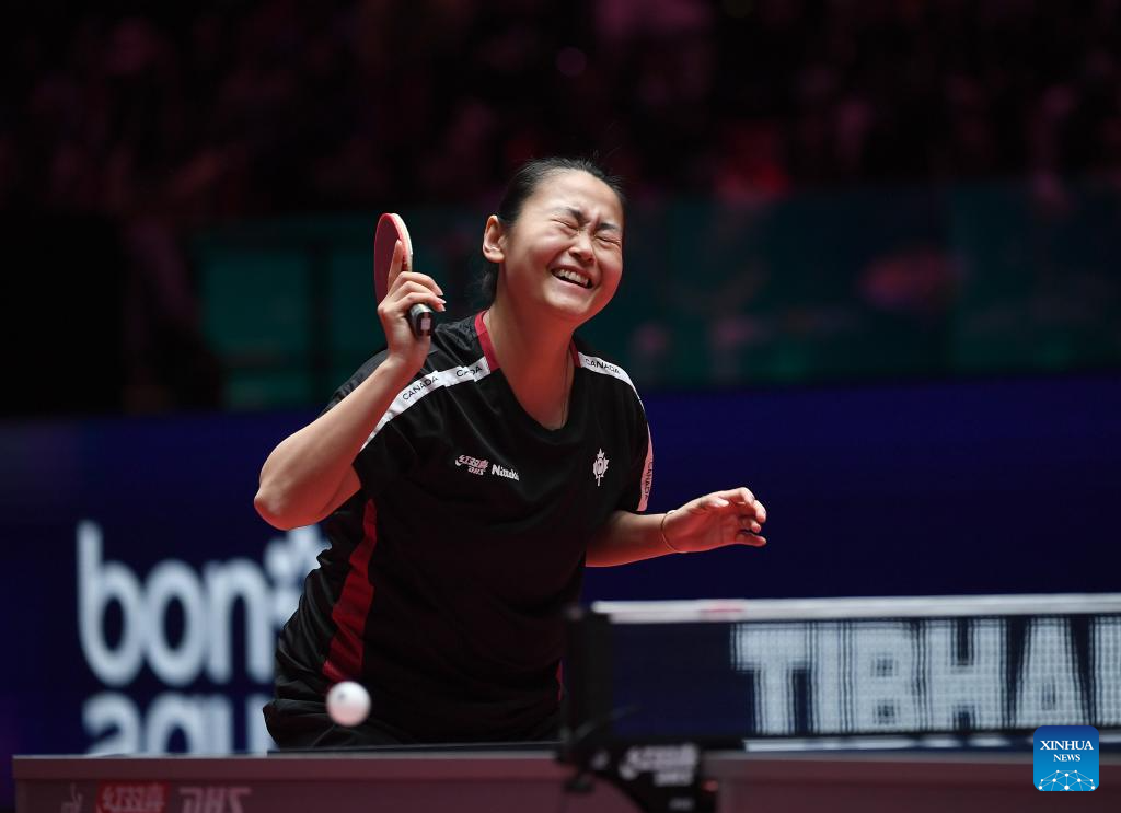 Zhang Mo reacts during the women's singles group match between Sun Yingsha of China and Zhang Mo of Canada at the ITTF Men's and Women's World Cup 2025 in Macao, China, April 15, 2025. (Xinhua/Chen Duo)