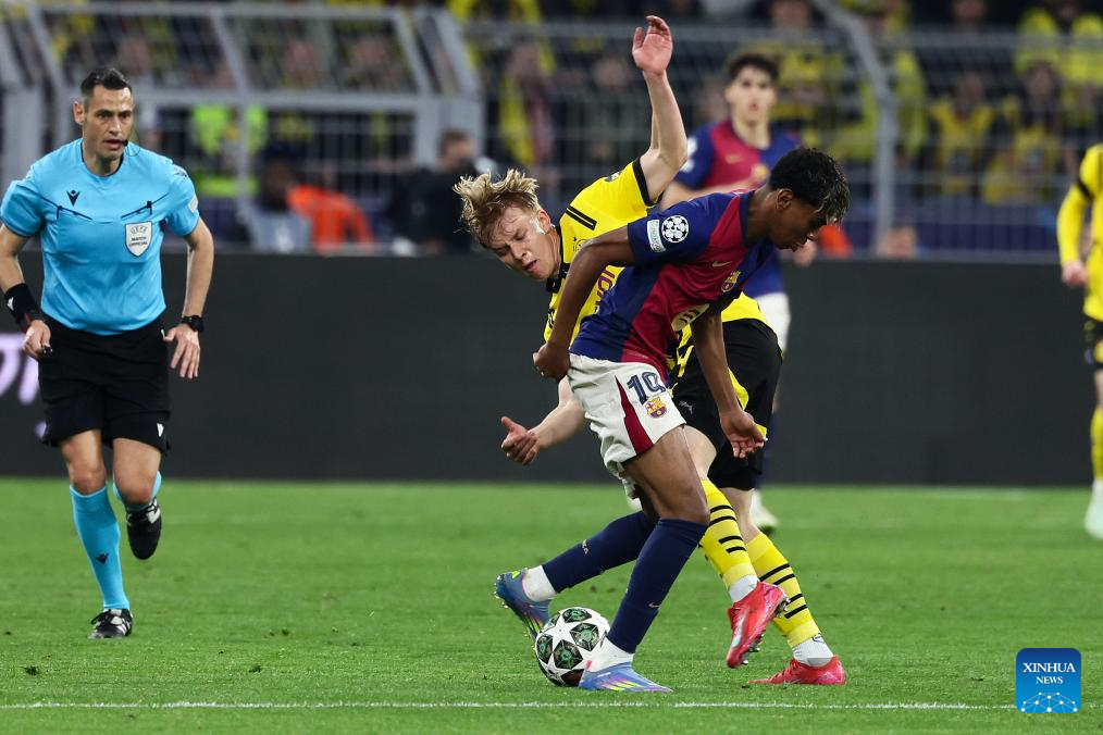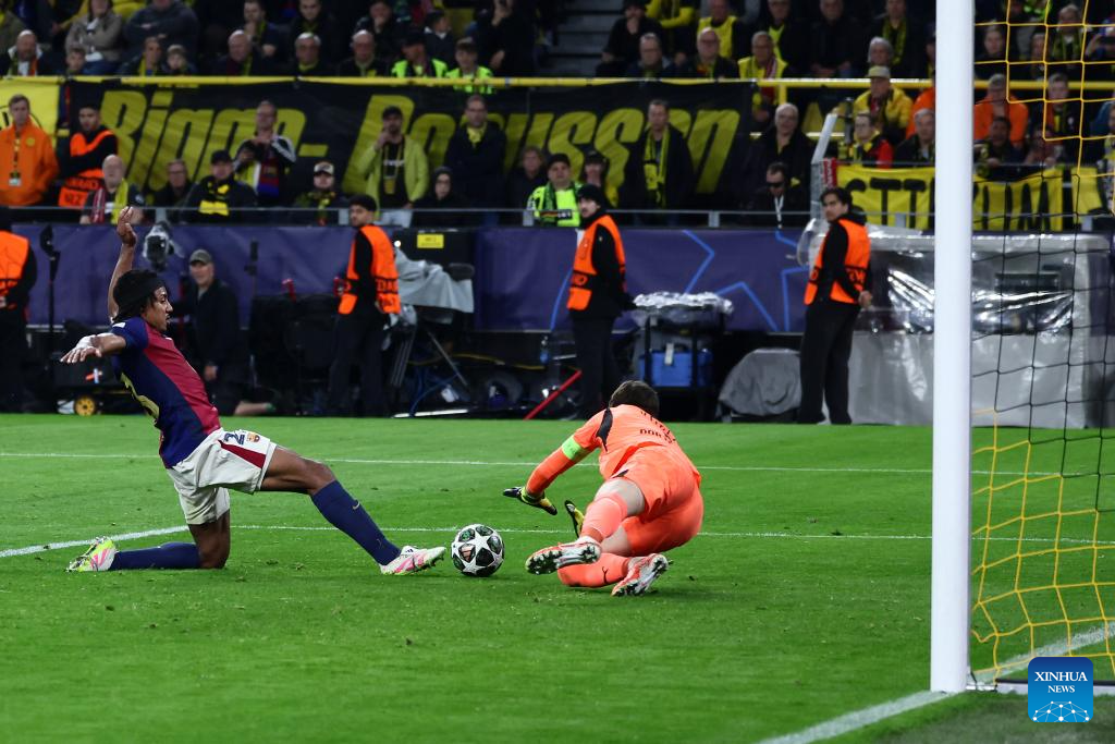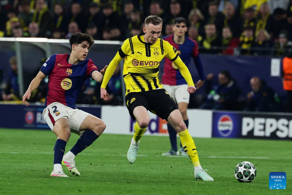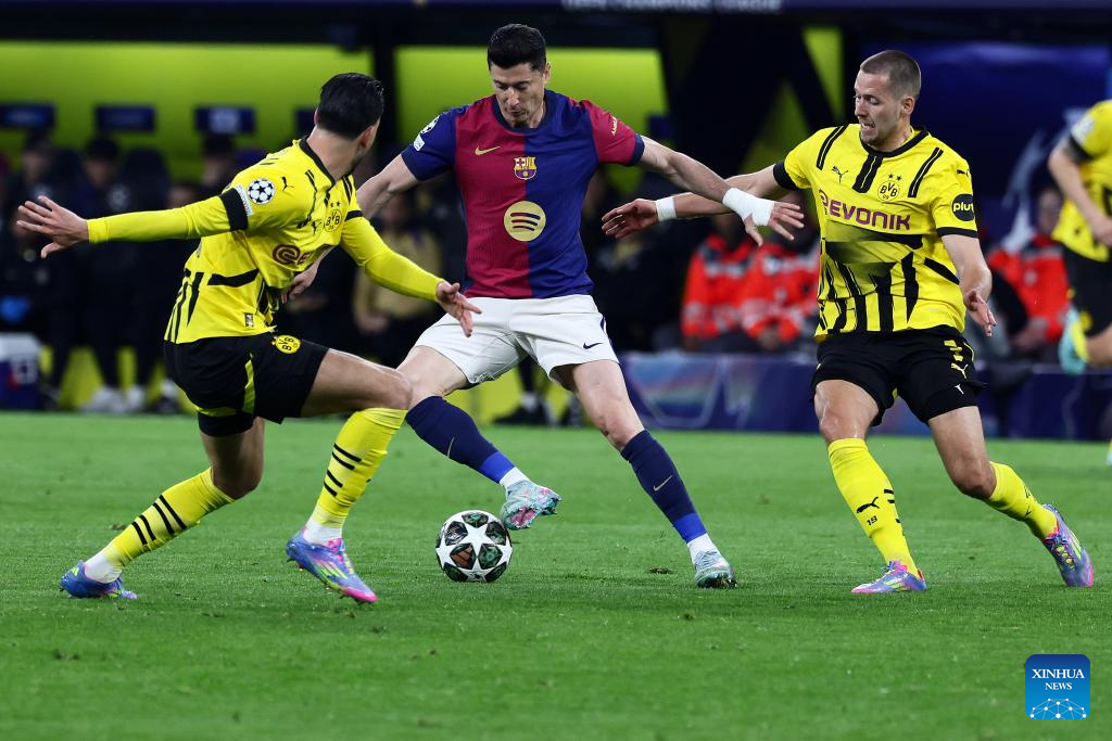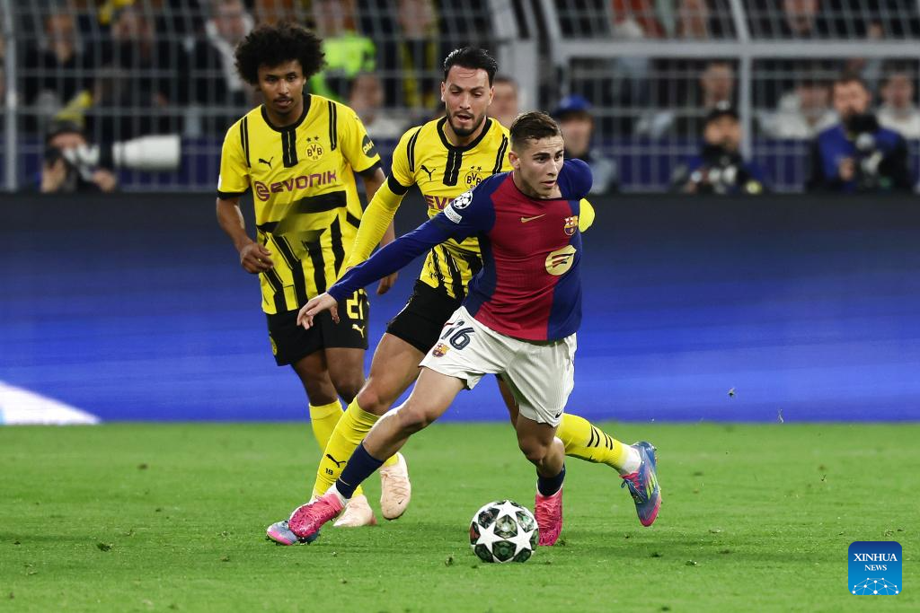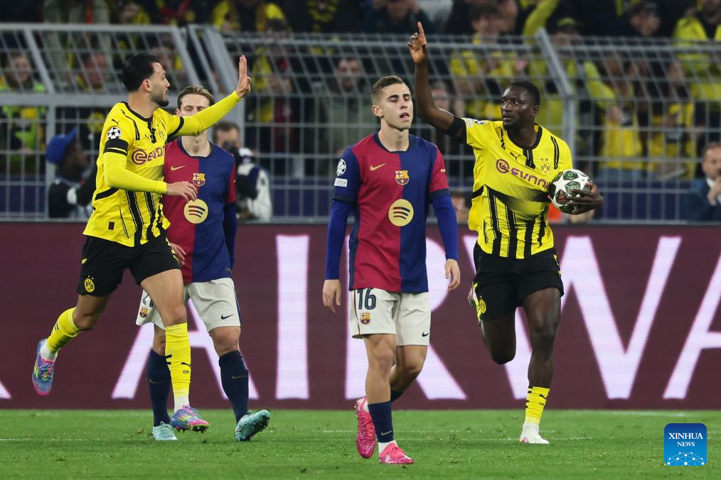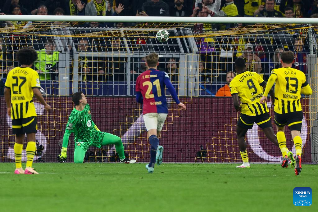 BERLIN, April 15 (Xinhua) -- Serhou Guirassy scored a stunning hat-trick, but Borussia Dortmund was knocked out of the UEFA Champions League by Barcelona on Wednesday night, despite a spirited 3-1 win in the quarterfinal second leg.