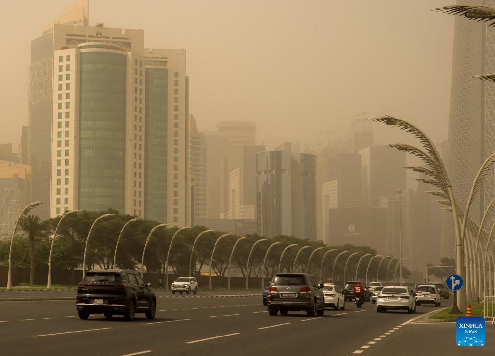 Vehicles pass in dense dust in Doha, Qatar, April 15, 2025. A sandstorm hit Doha on Tuesday. (Photo by Nikku/Xinhua)