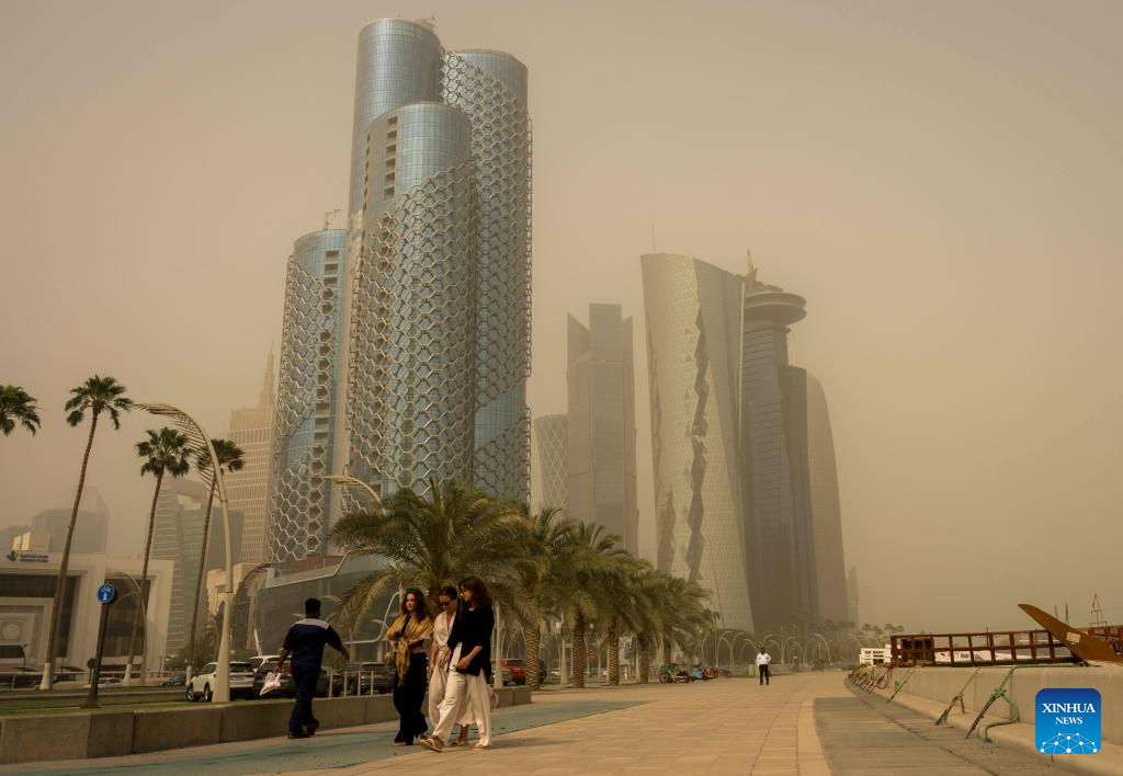 People walk in dense dust in Doha, Qatar, April 15, 2025. A sandstorm hit Doha on Tuesday. (Photo by Nikku/Xinhua)