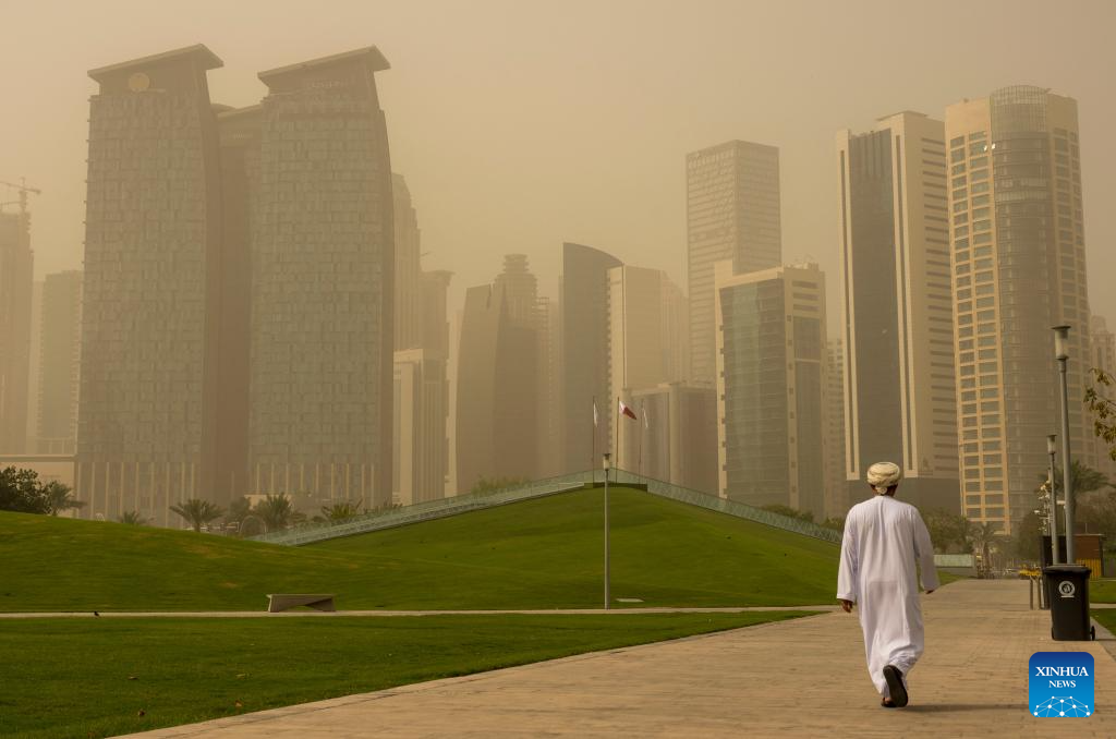 A man walks in dense dust in Doha, Qatar, April 15, 2025. A sandstorm hit Doha on Tuesday. (Photo by Nikku/Xinhua)
