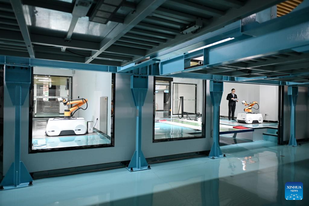 A staff member debugs an autonomous EV charging robot at an intelligent charging station in Xiong'an New Area, north China's Hebei Province, April 15, 2025. In recent years, the local power sector of Hebei has been promoting power grids construction of Xiong'an New Area in accordance with the standards of first-tier cities in China. Under the concept of green, innovative and smart development, the construction of electrical substations would be integrated with urban landscape design, and many intelligent power projects have been finished. (Xinhua/Mu Yu)