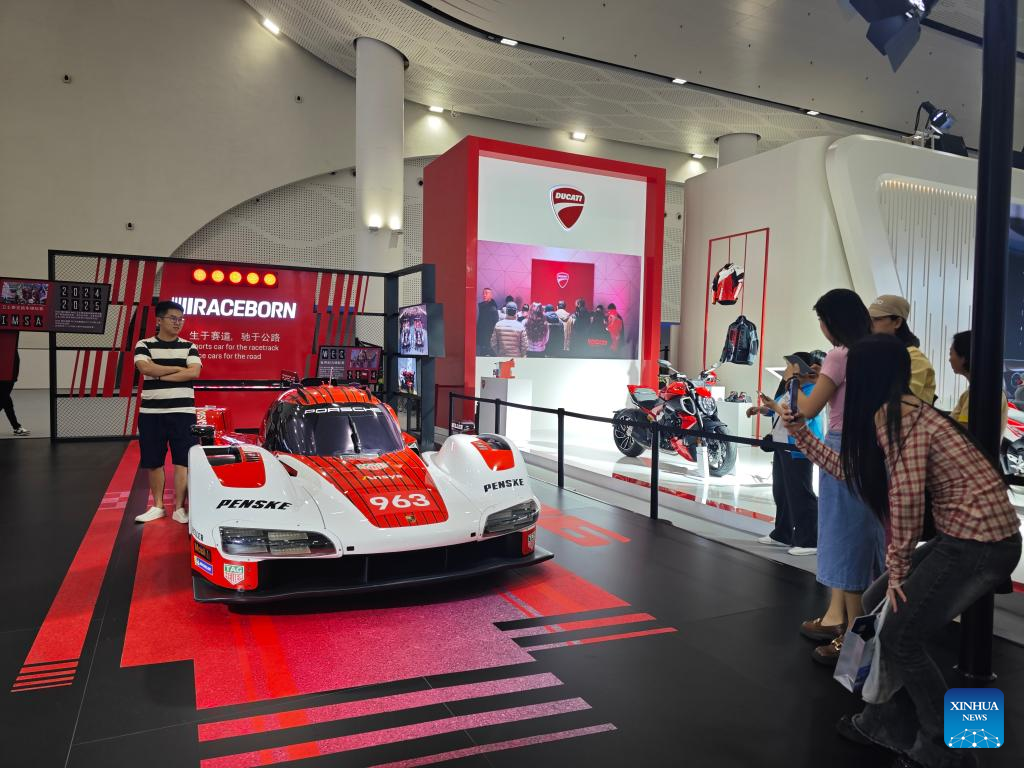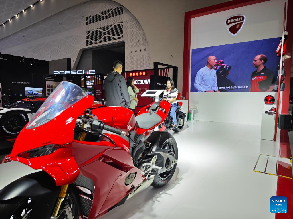 Visitors view the Ducati motorcycles at the 5th China International Consumer Products Expo (CICPE) in Haikou, capital of south China's Hainan Province, April 14, 2025. At the fashion lifestyle exhibition area of the ongoing consumer expo, six brands under Volkswagen Group China, including Volkswagen, Audi, Porsche and Bentley, showcased the latest advancements in luxury and electric mobility. (Xinhua/Zhou Huimin)