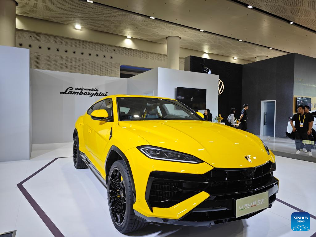 This photo taken on April 15, 2025 shows a Lamborghini car on display at the 5th China International Consumer Products Expo (CICPE) in Haikou, capital of south China's Hainan Province. At the fashion lifestyle exhibition area of the ongoing consumer expo, six brands under Volkswagen Group China, including Volkswagen, Audi, Porsche and Bentley, showcased the latest advancements in luxury and electric mobility. (Xinhua/Zhou Huimin)