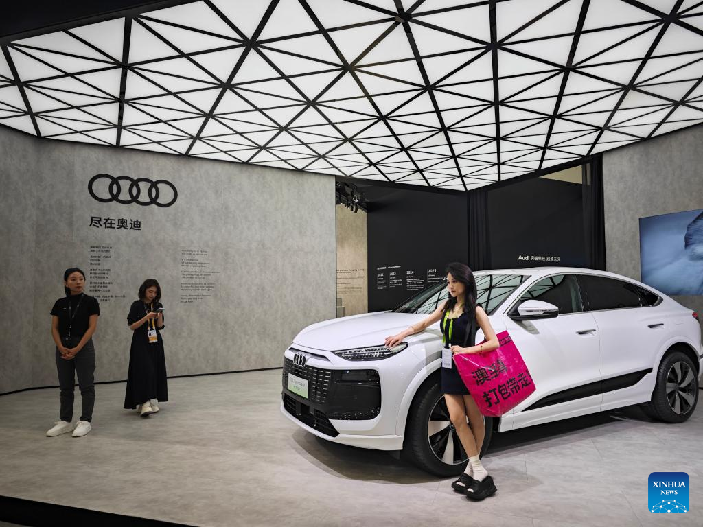 This photo taken on April 15, 2025 shows the booth of Audi at the 5th China International Consumer Products Expo (CICPE) in Haikou, capital of south China's Hainan Province. At the fashion lifestyle exhibition area of the ongoing consumer expo, six brands under Volkswagen Group China, including Volkswagen, Audi, Porsche and Bentley, showcased the latest advancements in luxury and electric mobility. (Xinhua/Zhou Huimin)