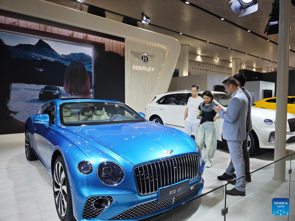 Visitors view a Bentley car at the 5th China International Consumer Products Expo (CICPE) in Haikou, capital of south China's Hainan Province, April 15, 2025. At the fashion lifestyle exhibition area of the ongoing consumer expo, six brands under Volkswagen Group China, including Volkswagen, Audi, Porsche and Bentley, showcased the latest advancements in luxury and electric mobility. (Xinhua/Zhou Huimin)