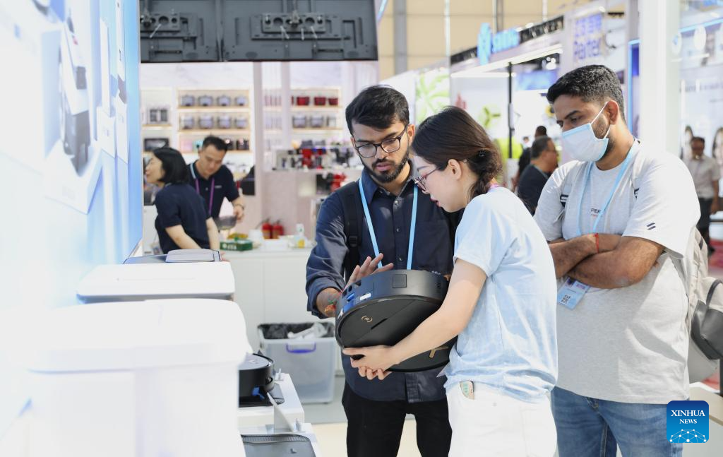 A buyer learns about an intelligent refrigerator during the 137th edition of the China Import and Export Fair in Guangzhou, south China's Guangdong Province, April 16, 2025. The 137th edition of the China Import and Export Fair, also known as the Canton Fair, kicked off on Tuesday, with the number of export exhibitors exceeding 30,000 for the first time in the history of this famous event.
