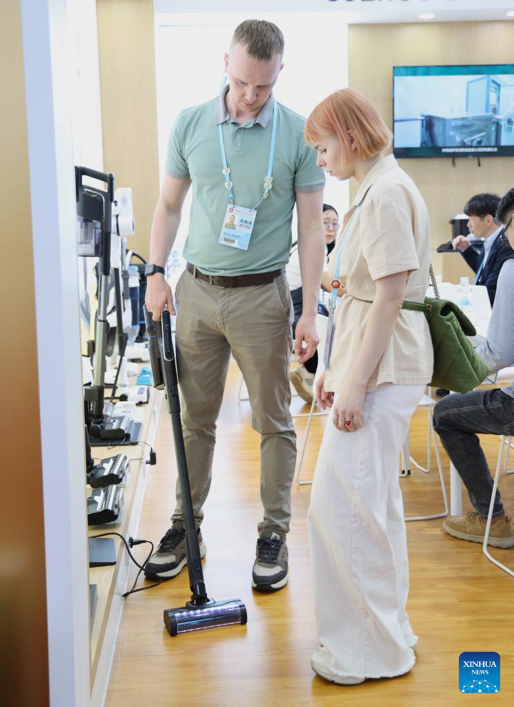 Foreign buyers try a dust collector during the 137th edition of the China Import and Export Fair in Guangzhou, south China's Guangdong Province, April 16, 2025. The 137th edition of the China Import and Export Fair, also known as the Canton Fair, kicked off on Tuesday, with the number of export exhibitors exceeding 30,000 for the first time in the history of this famous event.