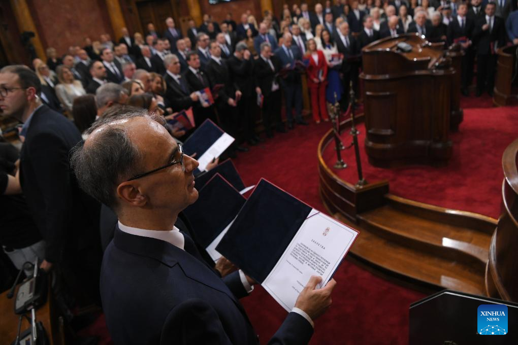Serbia's new cabinet members take the oath of office at the Serbian Parliament building in Belgrade, Serbia, on April 16, 2025. (Photo by Predrag Milosavljevic/Xinhua)