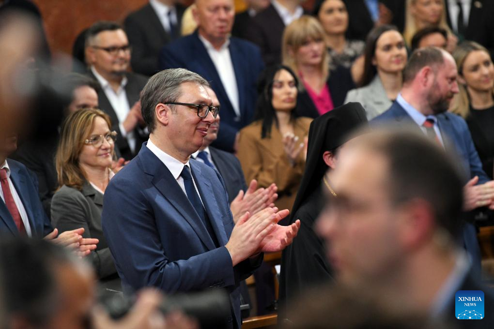 Serbian President Aleksandar Vucic attends the oath-taking ceremony of the new government at the Serbian Parliament building in Belgrade, Serbia, on April 16, 2025. (Photo by Predrag Milosavljevic/Xinhua)