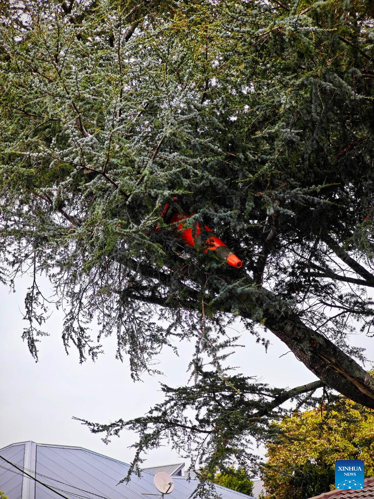 A traffic cone is blown into a tree by winds in Auckland, New Zealand, April 17, 2025. Ex-Tropical Cyclone Tam has unleashed severe weather across New Zealand's Northland and Auckland, leaving thousands without power and causing widespread damage as it tracks southward. (Photo by Wu Jiaxiang/Xinhua)