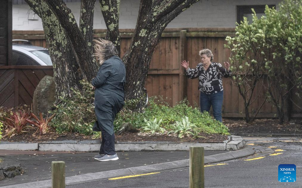 People feel the wind at the seaside in Auckland, New Zealand, April 17, 2025. Ex-Tropical Cyclone Tam has unleashed severe weather across New Zealand's Northland and Auckland, leaving thousands without power and causing widespread damage as it tracks southward. (Photo by Wu Jiaxiang/Xinhua)