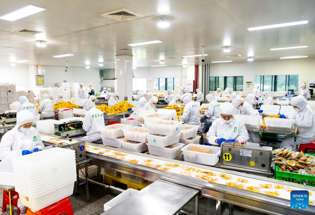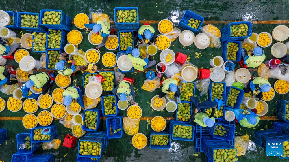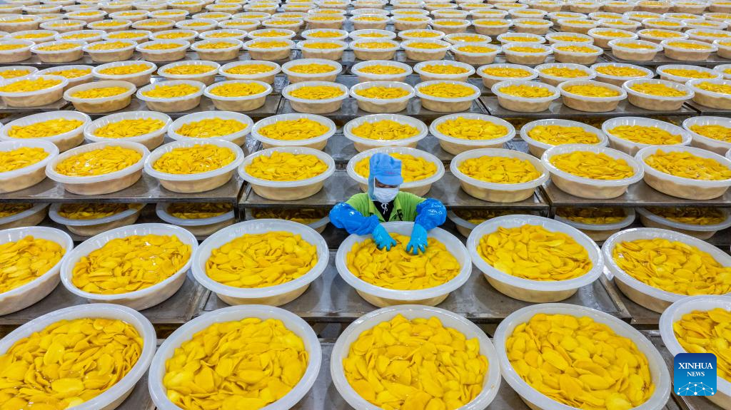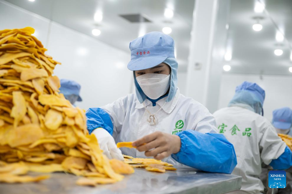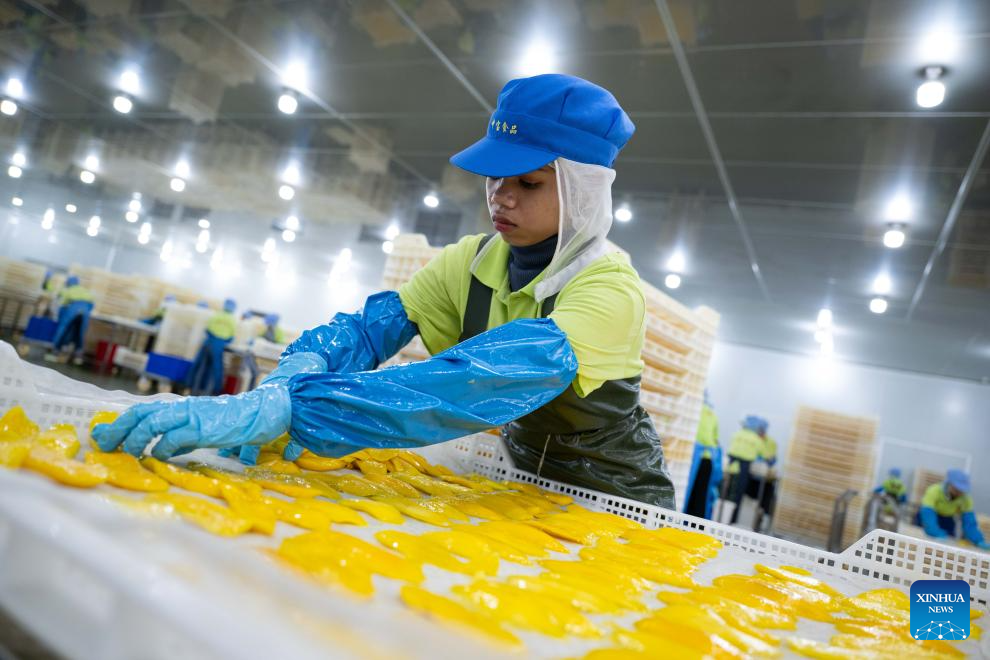 Workers are seen busy on the food processing line of Zhong Bao (Fujian) Food Science & Technology Co. Ltd. in Pinghe County of Zhangzhou City, southeast China's Fujian Province, March 26, 2025. In western Cambodia's Phnom Sruoch district, the abundant sunshine, plentiful rainfall, and fertile soil provide ideal natural conditions for mango cultivation, yielding mangoes featuring tender flesh and rich aroma.