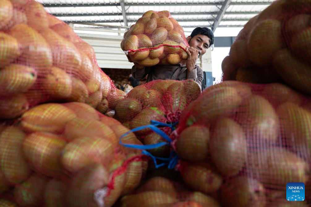 A worker carries a bag of mangoes at a mango processing factory in Phnom Sruoch district in Kampong Speu province, Cambodia, March 18, 2025. In western Cambodia's Phnom Sruoch district, the abundant sunshine, plentiful rainfall, and fertile soil provide ideal natural conditions for mango cultivation, yielding mangoes featuring tender flesh and rich aroma.