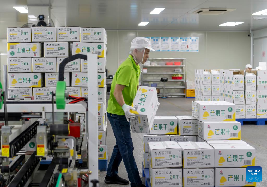 At the mango processing factory, invested and constructed by China's Zhong Bao (Fujian) Food Science & Technology Co. Ltd., in western Cambodia's Phnom Sruoch district, ripe mangoes undergo processes such as washing, peeling, slicing, sugar curing, and drying, finally transforming into sweet and chewy dried mango slices. These dried mangoes are then transported via sea shipping to Zhong Bao (Fujian) Food Science & Technology Co. Ltd. in southeast China's Fujian Province. After undergoing sorting, packaging, and packing, they can reach the shelves of Chinese supermarkets within days.