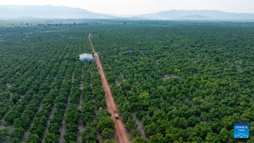 An aerial drone photo shows a mango orchard in Phnom Sruoch district in Kampong Speu province, Cambodia, March 18, 2025. In western Cambodia's Phnom Sruoch district, the abundant sunshine, plentiful rainfall, and fertile soil provide ideal natural conditions for mango cultivation, yielding mangoes featuring tender flesh and rich aroma.