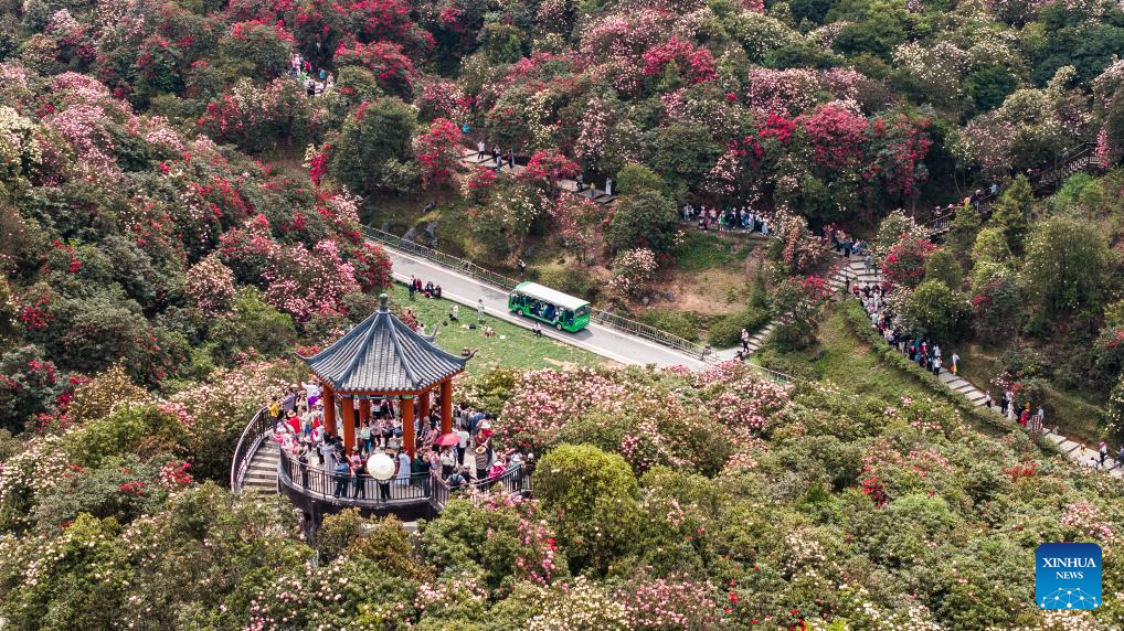 An aerial drone photo taken on April 16, 2025 shows blooming azaleas at Baili Azalea Nature Reserve in Bijie City, southwest China's Guizhou Province. The blooming azaleas in Bijie attract many tourists in spring. (Xinhua/Tao Liang)