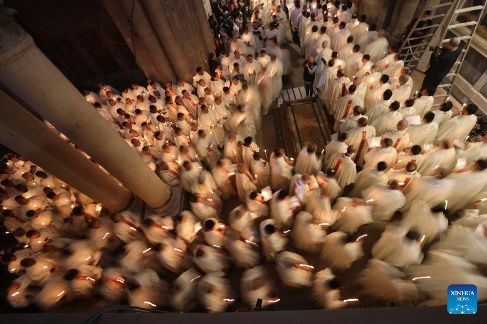 Christian monks and friars walk in procession at the Catholic Washing of the Feet ceremony during Easter Holy Week, at the Church of the Holy Sepulchre in Jerusalem, on April 17, 2025. (Photo by Jamal Awad/Xinhua)