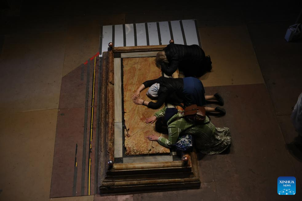 Christian worshipers pray at the Stone of Anointing at the Catholic Washing of the Feet ceremony during Easter Holy Week, at the Church of the Holy Sepulchre in Jerusalem, on April 17, 2025. (Photo by Jamal Awad/Xinhua)