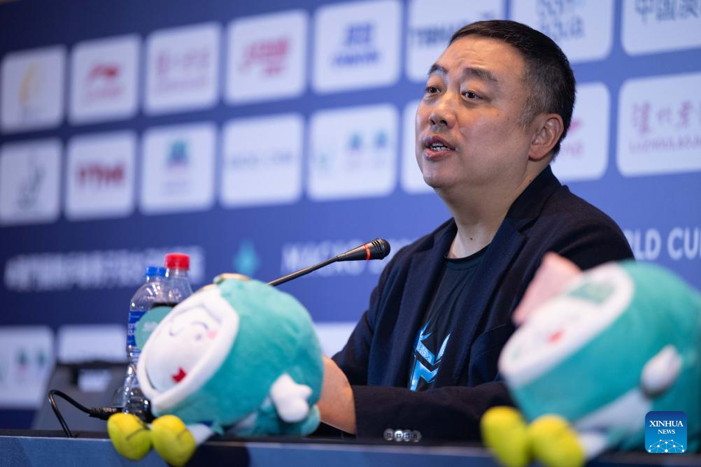 Liu Guoliang, deputy president of the International Table Tennis Federation (ITTF) and president of Chinese Table Tennis Association, attends a press conference of the ITTF Men's and Women's World Cup 2025 in Macao, China, April 18, 2025. (Xinhua/Cheong Kam Ka)