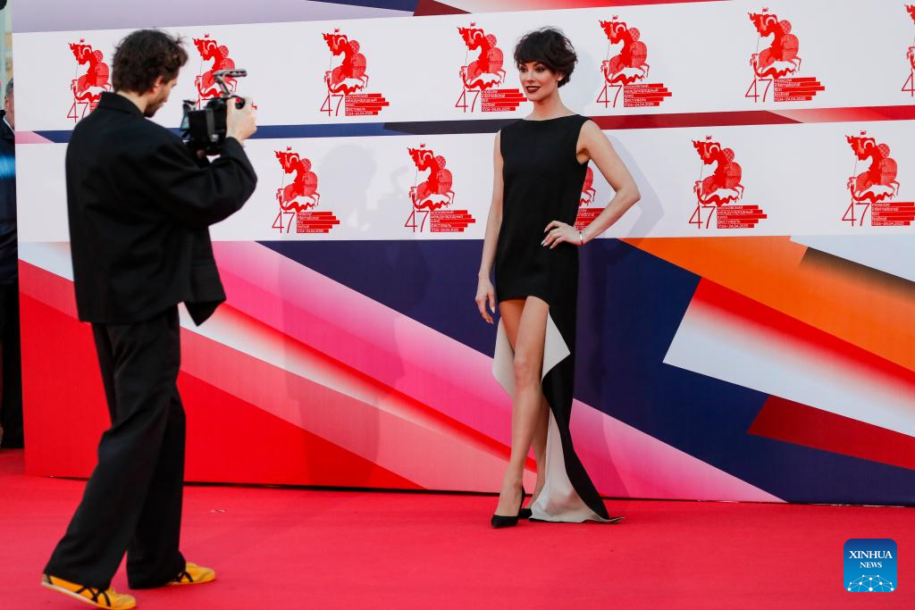 A guest poses for photos as she arrives to attend the opening ceremony of the 47th Moscow International Film Festival in Moscow, Russia, on April 17, 2025. The 47th Moscow International Film Festival opened Thursday in the Russian capital, with a dedicated BRICS film program featured among its lineup. (Photo by Alexander Zemlianichenko Jr/Xinhua)