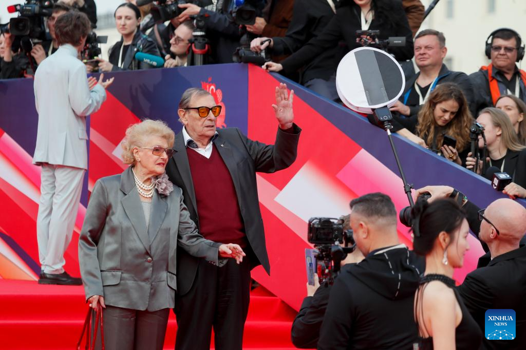 Guests pose for photos as they arrive to attend the opening ceremony of the 47th Moscow International Film Festival in Moscow, Russia, on April 17, 2025. The 47th Moscow International Film Festival opened Thursday in the Russian capital, with a dedicated BRICS film program featured among its lineup. (Photo by Alexander Zemlianichenko Jr/Xinhua)
