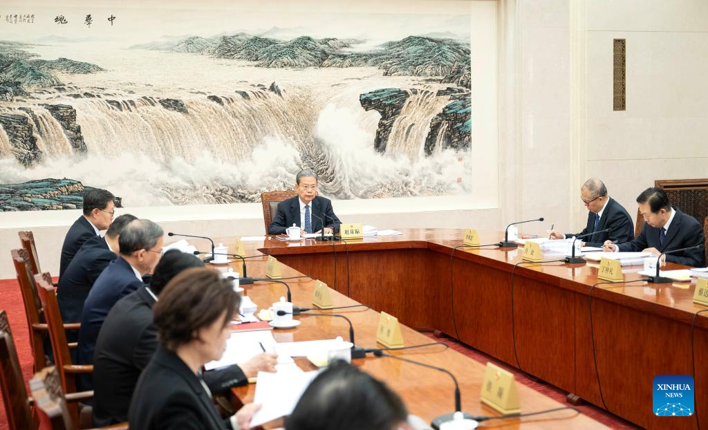 Zhao Leji, chairman of the National People's Congress (NPC) Standing Committee, presides over the 42nd meeting of the Council of Chairpersons of the 14th NPC Standing Committee at the Great Hall of the People in Beijing, capital of China, April 18, 2025. (Xinhua/Li Tao)
